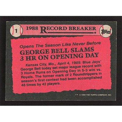 This is a 1989 Topps George Bell Record Breaker baseball card. The card is #1 and pictures show condition.
