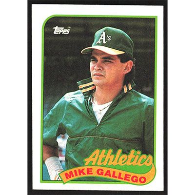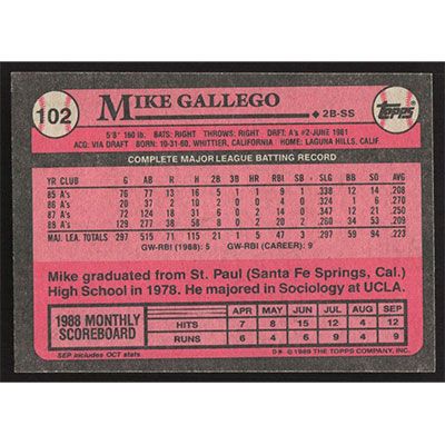 This is a 1989 Topps Mike Gallego baseball card. The card is #102 and pictures show condition.
