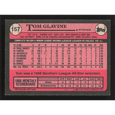 This is a 1989 Topps Tom Glavine baseball card. The card is #157 and pictures show condition.