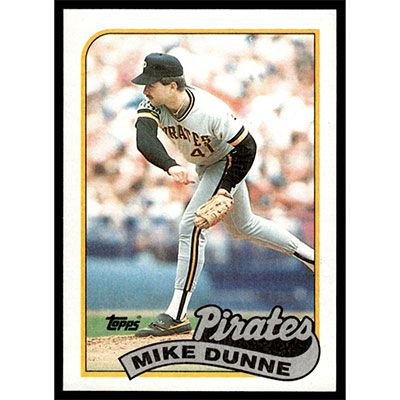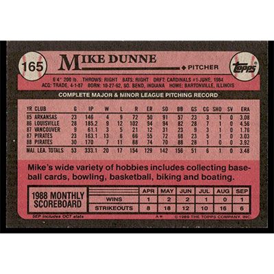 This is a 1989 Topps Mike Dunne baseball card. The card is #165 and pictures show condition.