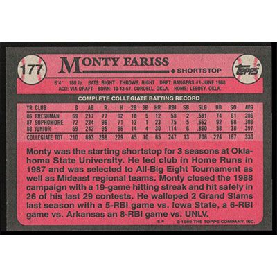 This is a 1989 Topps Monty Fariss #1 Draft Pick baseball card. The card is #177 and pictures show condition.