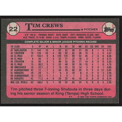 This is a 1989 Topps Tim Crews baseball card. The card is #22 and pictures show condition.