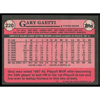 This is a 1989 Topps Gary Gaetti baseball card. The card is #220 and pictures show condition.