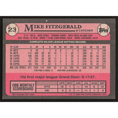 This is a 1989 Topps Mike Fitzgerald baseball card. The card is #23 and pictures show condition.
