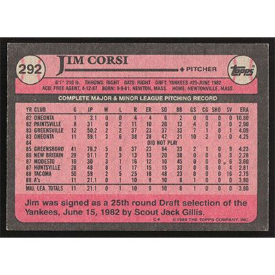 This is a 1989 Topps Jim Corsi baseball card. The card is #292 and pictures show condition.