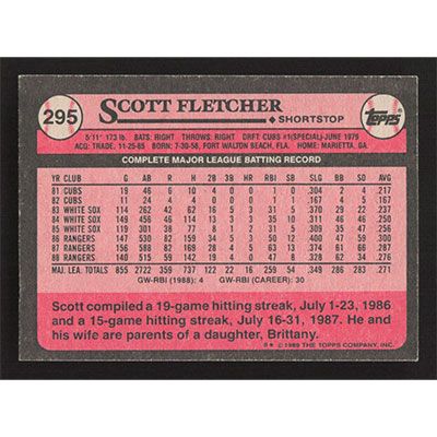This is a 1989 Topps Scott Fletcher baseball card. The card is #295 and pictures show condition.
