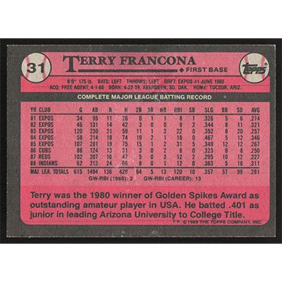 This is a 1989 Topps Terry Francona autographed baseball card. This card has been signed, in blue, by Terry Francona, and is guaranteed authentic by Ballcardz.com. The card is #31 and pictures show condition.