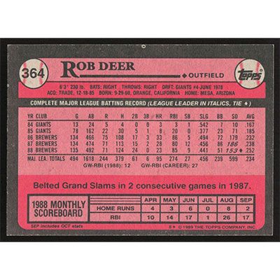 This is a 1989 Topps Rob Deer baseball card. The card is #364 and pictures show condition.