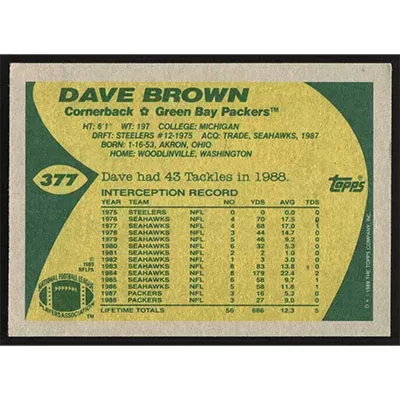 This is a 1989 Topps Dave Brown football card. The card is #377 and pictures show condition.