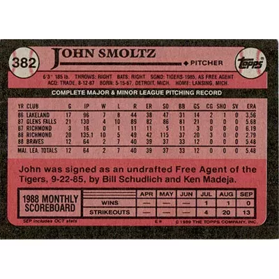 This is a 1989 Topps John Smoltz autographed baseball card. This card is signed, in blue, by John Smoltz, and is guaranteed authentic by Ballcardz.com. The card is #382 and is in NM-MT condition.