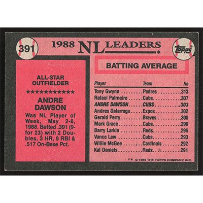 This is a 1989 Topps Andre Dawson All-Star baseball card. The card is #391 and pictures show condition.