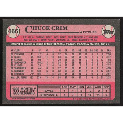 This is a 1989 Topps Chuck Crim baseball card. The card is #466 and pictures show condition.