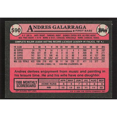 This is a 1989 Topps Andres Galarraga baseball card. The card is #590 and pictures show condition.