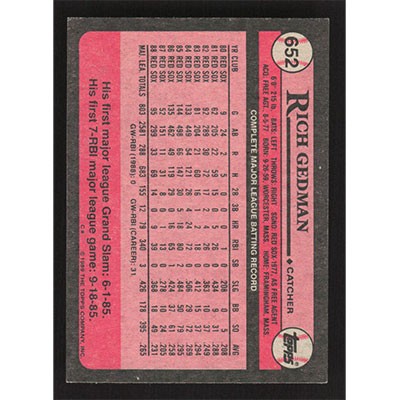 This is a 1989 Topps Rich Gedman baseball card. The card is #652 and pictures show condition.