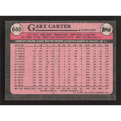 This is a 1989 Topps Gary Carter baseball card. The card is #680 and pictures show condition.