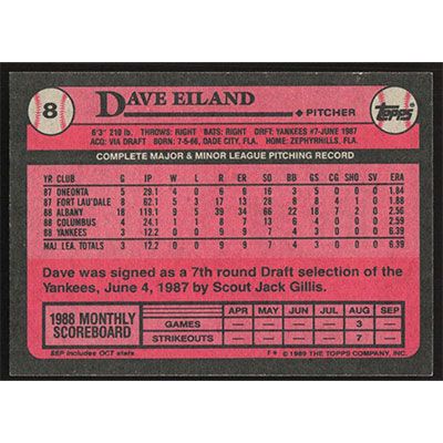 This is a 1989 Topps Dave Eiland baseball card. The card is #8 and pictures show condition.