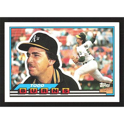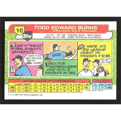 This is a 1989 Topps Big Todd Burns baseball card. The card is #10 and pictures show condition.