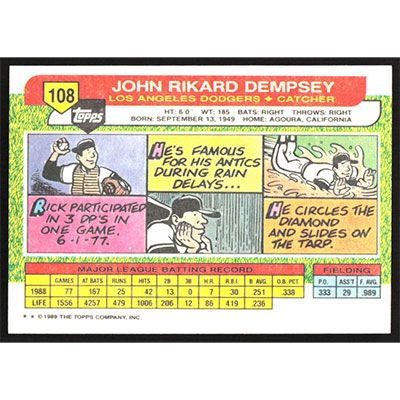 This is a 1989 Topps Big Rick Dempsey baseball card. The card is #108 and pictures show condition.
