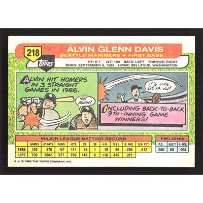 This is a 1989 Topps Big Alvin Davis baseball card. The card is #218 and pictures show condition.