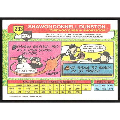 This is a 1989 Topps Big Shawon Dunston baseball card. The card is #233 and pictures show condition.