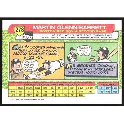 This is a 1989 Topps Big Marty Barrett baseball card. The card is #278 and pictures show condition.