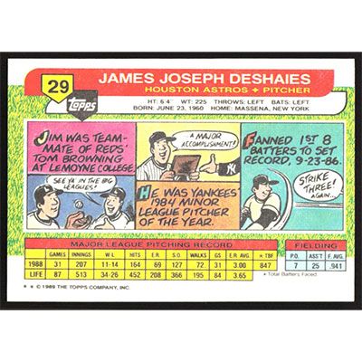 This is a 1989 Topps Big Jim Deshaies baseball card. The card is #29 and pictures show condition.