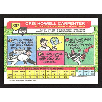 This is a 1989 Topps Big Cris Carpenter baseball card. The card is #307 and pictures show condition.