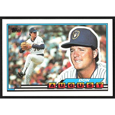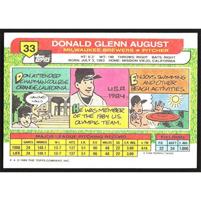 This is a 1989 Topps Big Don August baseball card. The card is #33 and pictures show condition.