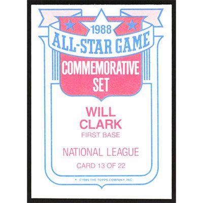 This is a 1989 Topps Glossy All-Stars Will Clark baseball card. The card is #13 and pictures show condition.
