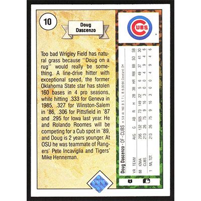 This is a 1989 Upper Deck Doug Dascenzo Star Rookies baseball card. The card is #10 and pictures show condition. Team(s): Chicago Cubs Rookie Card (RC)
