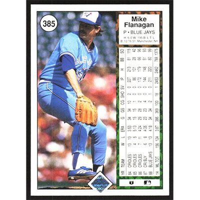 This is a 1989 Upper Deck Mike Flanagan baseball card. The card is #385 and pictures show condition.