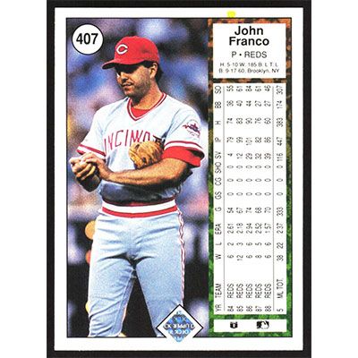 This is a 1989 Upper Deck John Franco baseball card. The card is #407 and pictures show condition.