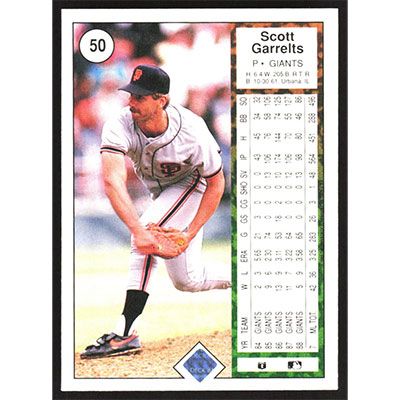 This is a 1989 Upper Deck Scott Garrelts baseball card. The card is #50 and pictures show condition.