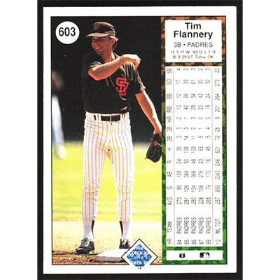 This is a 1989 Upper Deck Tim Flannery baseball card. The card is #603 and pictures show condition.