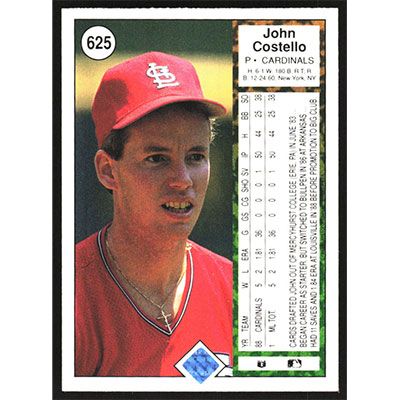 This is a 1989 Upper Deck John Costello baseball card. The card is #625 and pictures show condition.
