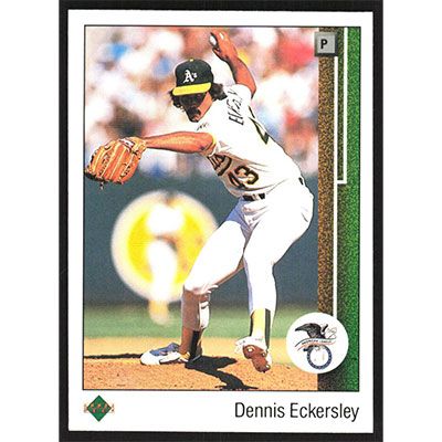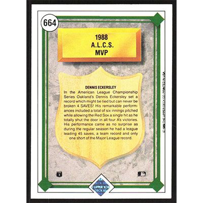 This is a 1989 Upper Deck Dennis Eckersley ALCS MVP baseball card. The card is #664 and pictures show condition.
