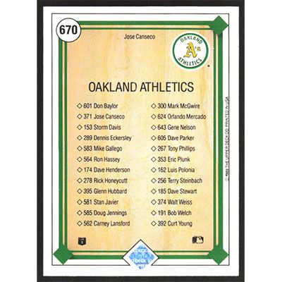 This is a 1989 Upper Deck Jose Canseco Team Checklist baseball card. The card is #670 and pictures show condition.
