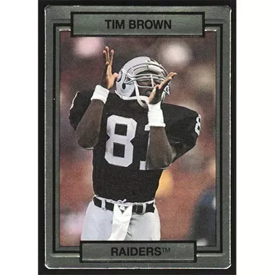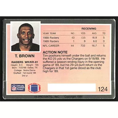 This is a 1990 Action Packed Tim Brown football card. The card is #124 and pictures show condition.