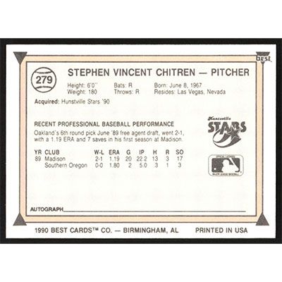 This is a 1990 Best Stephen Chitren baseball card. The card is #279 and pictures show condition.