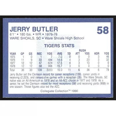 This is a 1990 Clemson Collegiate Collection Jerry Butler football card. The card is #58 and pictures show condition.