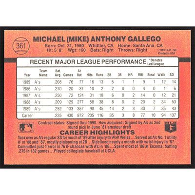 This is a 1990 Donruss Mike Gallego baseball card. The card is #361 and pictures show condition.