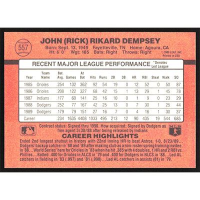 This is a 1990 Donruss Rick Dempsey baseball card. The card is #557 and pictures show condition.