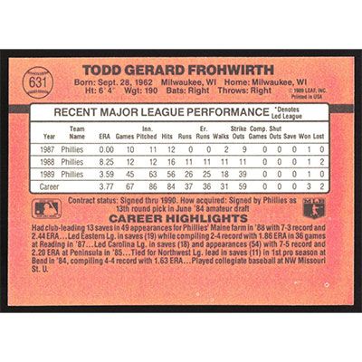 This is a 1990 Donruss Todd Frohwirth baseball card. The card is #631 and pictures show condition.