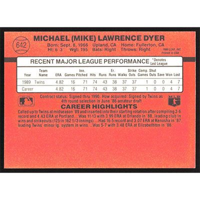 This is a 1990 Donruss Mike Dyer baseball card. The card is #642 and pictures show condition.
