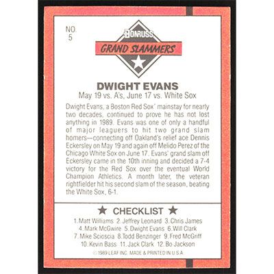 This is a 1990 Donruss Grand Slammers Dwight Evans baseball card. The card is #5 and pictures show condition.