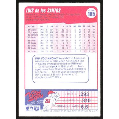 This is a 1990 Fleer Luis de los Santos baseball card. The card is #105 and pictures show condition.