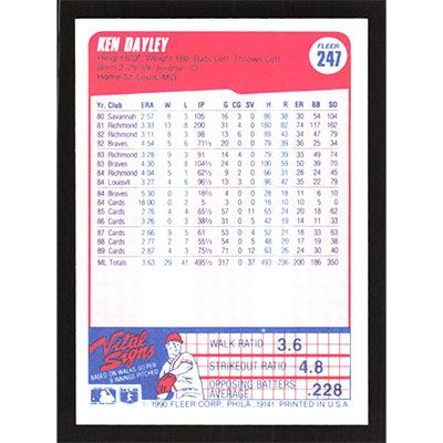 This is a 1990 Fleer Ken Dayley baseball card. The card is #247 and pictures show condition.