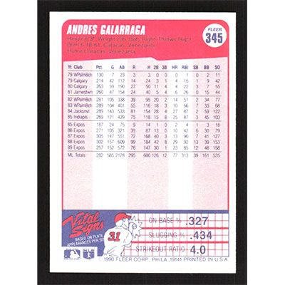 This is a 1990 Fleer Andres Galarraga baseball card. The card is #345 and pictures show condition.