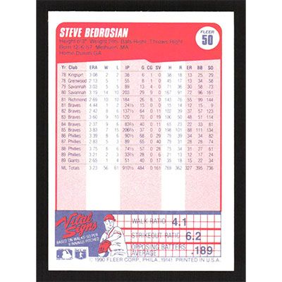 This is a 1990 Fleer Steve Bedrosian baseball card. The card is #50 and pictures show condition.