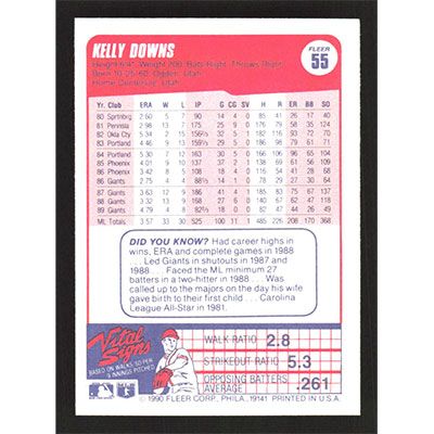 This is a 1990 Fleer Kelly Downs baseball card. The card is #55 and pictures show condition.